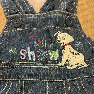 Adorable denim overalls for kids. Features a playful dalmatian print. Perfect for everyday wear or Disney collector