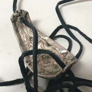 This striking bracelet features a detailed silver centerpiece with intricate scrollwork, mounted on multiple strands of black leather. The contrast between the dark straps and the metallic centerpiece creates a dramatic and elegant look, perfect for adding a touch of gothic flair to any outfit.
