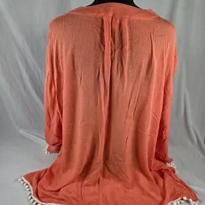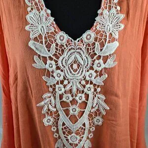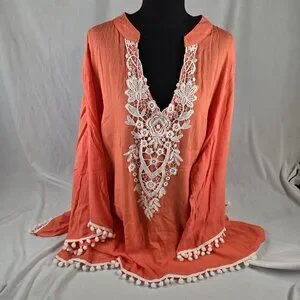 Versatile long tunic - can be worn as a top or as a swimsuit cover-up. Beautiful lace detail, and fun playful pom pom trim on sleeves and hem. Excellent condition.