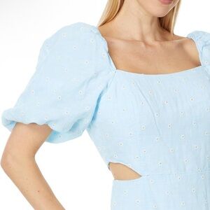 Color Hydra Blue You Drive Me Daisy Embroidered Linen dress with puff sleeves and floral embroidery. Features a square neckline and cut-out details.