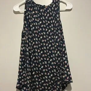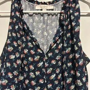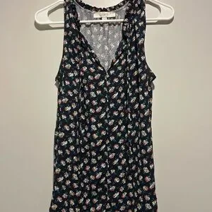 This elegant LOFT tank top features a black background adorned with a delicate white floral pattern. The sleeveless design and surplice neckline offer a relaxed yet stylish fit, perfect for any casual outing. Crafted from lightweight fabric, it ensures comfort and effortless style.