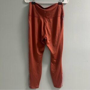 Excellent condition size Women’s Large dark mauve color with baby blue decorative lace look design down the outside of both legs. There’s a baby blue sports bra that matches in my closet.