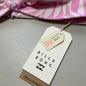 The product is a Billabong swim bikini top in a pink color with a tropical floral pattern, featuring a bandeau style and halter strap. Made from a blend of polyester and elastane, it is designed for women and comes in a size small. The top is perfect for those looking for a stylish and comfortable swimwear option that exudes a tropical vibe, ideal for lounging by the pool or heading to the beach for a fun day of sun and surf.