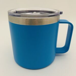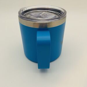 This is a new with box 15 ounce capacity reusable stainless steel insulated travel mug with handle and removable lid. The lid has a slide lock feature to cover the sip opening. The mug is turquoise blue and says CLUB WYNDHAM on the front. Great for your hot or cold beverages while on the go or to use at home.