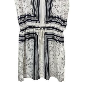 The dress in the image has a casual yet chic feel, with its relaxed silhouette, drawstring waist, and abstract black and white pattern
