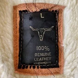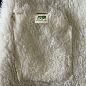 Some discoloration around pockets, and some white speckles in one area, as shown. No other flaws to note. 100% genuine suede leather. Faux Sherpa fleece lining. Snaps up the front. Classic! Please zoom in on photos for measurements and condition.