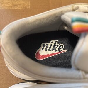 These Nike sneakers feature a sleek, low-top silhouette with a predominantly white colorway, embodying the classic Air Max design but with baby blue, teal, yellow, and orange ribbon accent on the top of the tongue and back of heel. Perfect for those who appreciate a retro-inspired aesthetic with modern comfort.