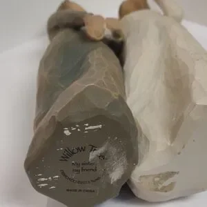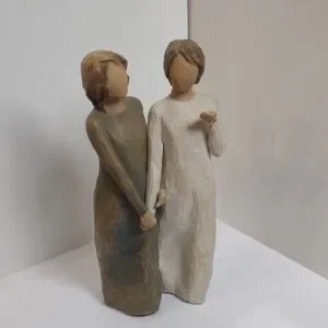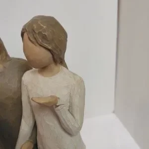 This Willow Tree sculpture captures the essence of connection through its minimalist design and earthy tones. Crafted in brown and cream, the piece embodies the brand's signature style, focusing on gesture and form to convey emotion. Perfect for art enthusiasts, it adds a touch of warmth and sentiment to any space. *note picture of hand that was broken and glued back on, does not affect integrity of piece.
