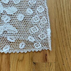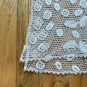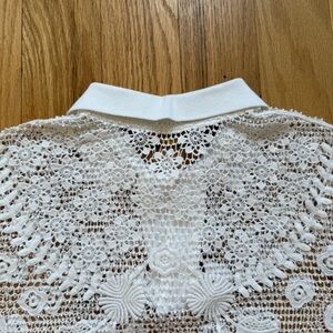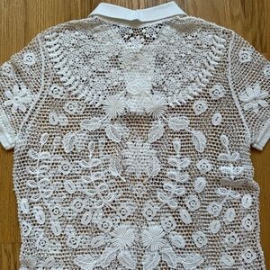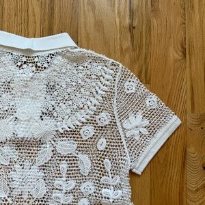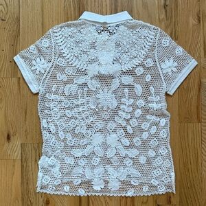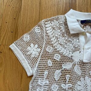Polo Ralph Lauren Lace Polo Shirt in White - Straight Fit, Intended to Hit at Hip - Delicate Cotton Lace Construction - Embroidered Florals Punctuate Transparent shell - Classic Flat-Knit Polo Collar - Two-Button Placket - Short Sleeve with Armbands - Tennis Tail - Scalloped Hem - Size Medium - Worn Once