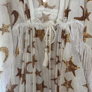 Elegant white kaftan featuring gold star and moon patterns. Perfect for a chic, bohemian look. Celestial Sequin- star moon Dress - Magical dresses for Special moments, wedding, maternity, photos, photography, evening by Flutterdress on Etsy. Brand new in bag never worn. I would say it is one size fits all and it is very flowy with tie in the back. Dress is very adjustable in size and flattering to large and small figures. Perfect for Taylor Swift concert.