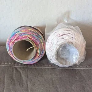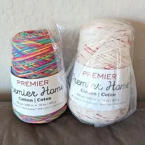 2 NEW Premier Home Cotton yarn cones. This is 85% recycled cotton and 15% polyester. #4 Medium weight. Colors are Rainbow and Jelly Dots (a creamy white with pink and red pieces throughout).
