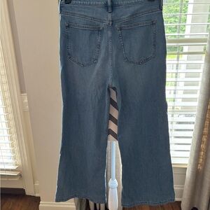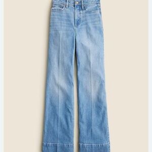 These J. Crew jeans feature a high-rise waist and a classic blue wash, offering a timeless vintage-inspired look. The wide flared legs and subtle ombré effect add a touch of retro charm, while the raw hem provides a modern twist.