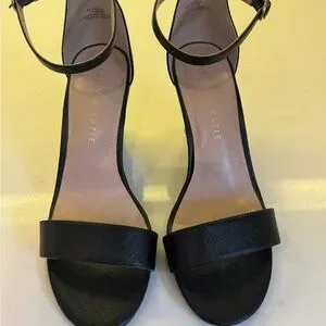 These Kelly & Katie wedges feature a sleek black design with a thin ankle strap and a comfortable 3 inch wedge heel. The open-toe style and minimalist silhouette make them perfect for any occasion, offering both elegance and versatility.