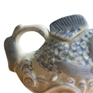Vintage porcelain blue and white teapot with lid shaped as a fish swimming on the water.
