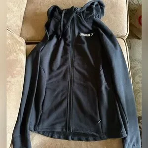 Stylish black zip-up hoodie by Gymshark. Features a comfortable fit and hood.