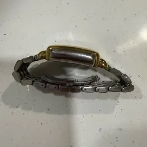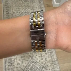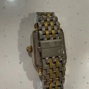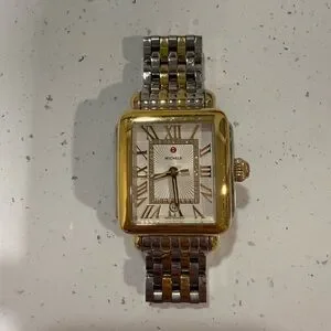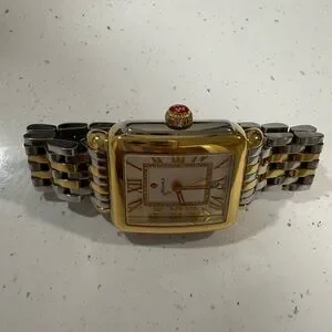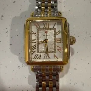 Stylish Michele watch with a square face. Features Roman numerals and a two-tone band.