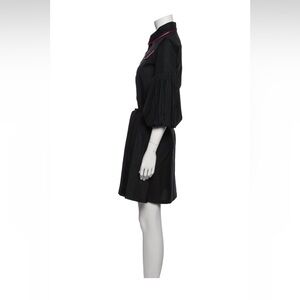 This stylish black dress is perfect for both casual and work settings, featuring a notched collar and 3/4 bishop sleeves. The pink trim adds a pop of color, while the self-tie belt cinches the waist for a flattering fit. Its mini to knee-length design offers a modern and versatile look. Great condition