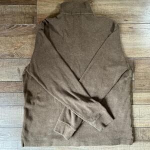 This Polo Ralph Lauren Estate Rib 1/4 Zip Pullover Sweater in size L is a classic and stylish piece for men. Made from 100% cotton knit fabric, it features a solid brown color, mock neck with a zipper accent, and long sleeves for a comfortable fit. Perfect for various occasions like casual outings, workwear, or formal events, this sweater carries a designer theme that is both timeless and preppy. With its 1/4 zip feature, it is suitable for layering in all seasons, making it a versatile addition to any wardrobe.
