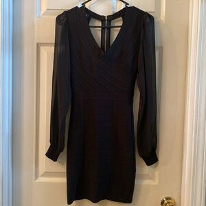 Stylish black dress with long sleeves. Features a V-neck and tailored fit. Ideal for formal events.
