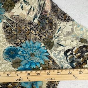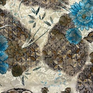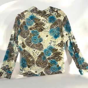Stylish button-up shirt with a vibrant floral pattern. Features shades of blue and brown on a cream background.