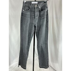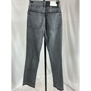 Eb Denim 'Unraveled' Black Cotton Two Jean Size 26: button fly, 5-pocket styling, frayed split hem, measurements: 12 inch bust x 42 inch length.