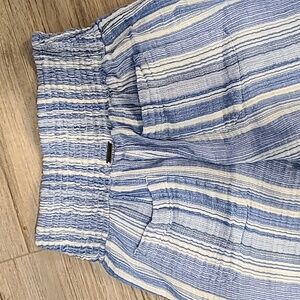 Stylish wide leg pants by Billabong. Features blue and white stripes. Best for petite women as length is short!
