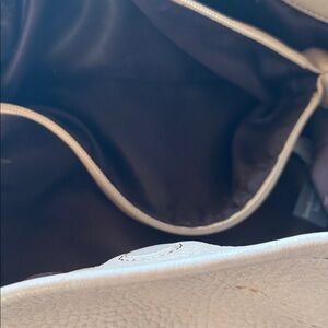 GUC Vintage Kenneth Cole Cream Color Pebbled Leather unstructured Shoulder Bag with Brass buckle, chain hardware. Brass studs reinforce the straps. Magnetic closure, inside full zipper pocket, interior side zipper pocket, key ring, two open pockets, open pocket for ink pen. Minor scrape on one side, corner rubs(see pics), surface soil easily removable. Polyester lining has no rips or stains. Straps have wear underneath (see pics). Dust bag included.