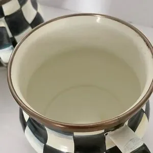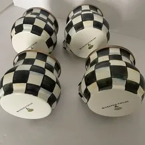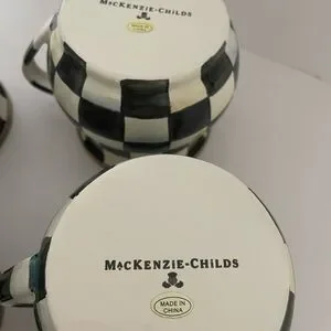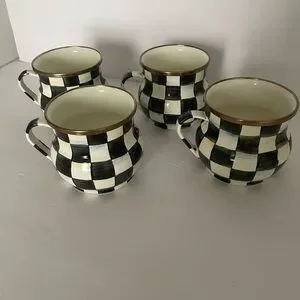 Like new these cute MacKenzie Childs black and white check teacups or coffee cups are hand painted enamel with bronze stainless steel rims. Each hand crafted cup is 10 oz, 2.75” H, 3.5” W. These unique mugs in MacKenzie Childs signature iconic pattern are tea party worthy. These designer cups will surely make a statement on your table or coffee bar. Excellent preloved condition. No flaws. Fast shipping. Sold as a set of 4.