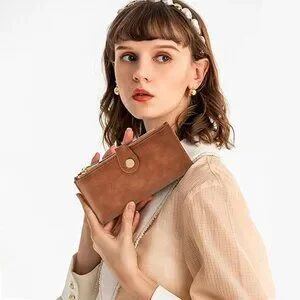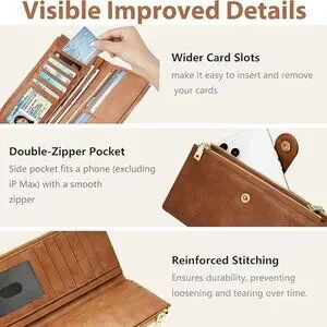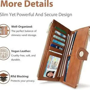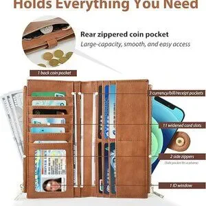 Ample Capacity & Functionality:This thin womens wallet slim features 11 widened card slots, 1 ID window, 3 currency/bill/receipt pockets, 2 side zippers, and 1 back coin pocket. The clear ID window with thumb hole and widened slots make card access easy. Despite its slim profile, this women's leather wallets design offers ample space for cards, ID, cash, coins, receipts, and even your phone.