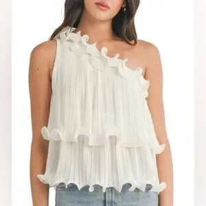 This Lush tank top features a chic asymmetrical design with flutter sleeves and tiered ruffles, all in a crisp white hue. Its lightweight fabric and flowing silhouette make it perfect for both casual and elegant settings.