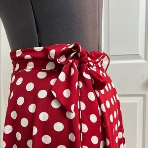 Chic and playful, this A-line skirt features a vibrant red base with classic white polka dots. Perfect for adding a pop of color to your wardrobe.