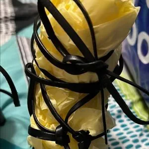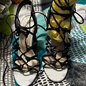 Chic black lace-up sandals by Vince Camuto. Stylish and versatile for any outfit. Has snake print on toes and stiletto heels. Very sexy!