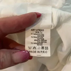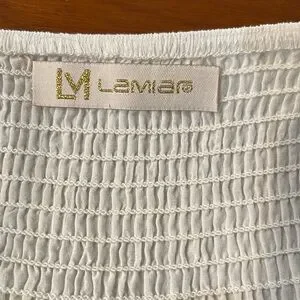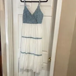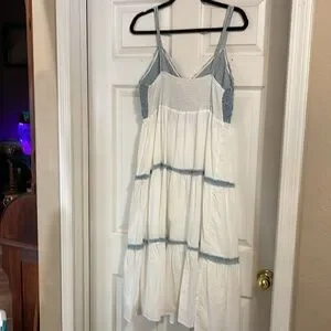 Bought this cutie on a cruise and love the fun denim and cotton combo. Measures 6” from bottom of V neck to waist. 31” from waist to hem. 16” across bottom of denim at waist with smocked back relaxed and 21.5” stretched. Skirt is full lined. It is a really pretty piece that would look great with black heels and pearls, at a beach wedding, or with a cowboy hat and boots at a rodeo. The straps are not adjustable.
