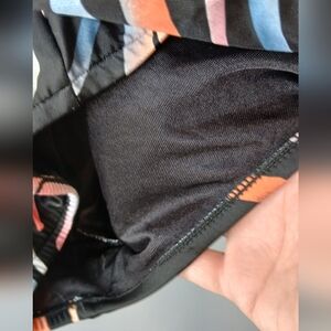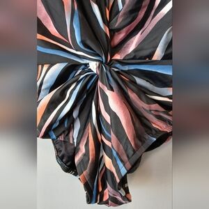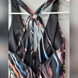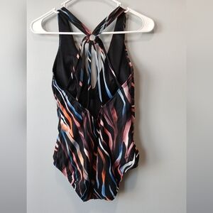 Miraclesuit multicolor waves on black one piece swimsuit. Slimming design and sexy strappy back.