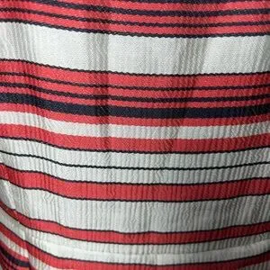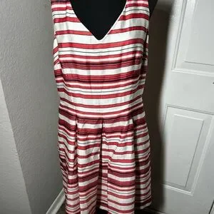 Vibrant mini dress with red and white stripes. Sleeveless design. Perfect for casual outings.