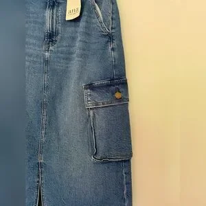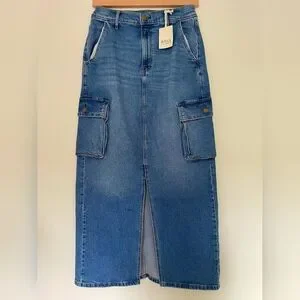 This a.n.a skirt in a classic blue shade is crafted from durable denim, offering a comfortable fit with a front slit, for everyday wear. Its casual design makes it a versatile addition to any wardrobe.