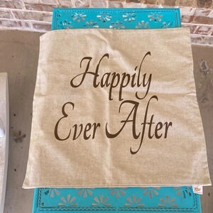 Light tan pillow cover with Happily Ever After written on it in brown lettering