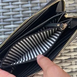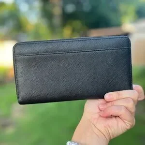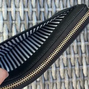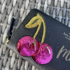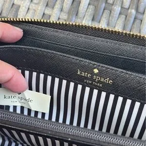 kate spade New York -Lacey zip around continental wallet -Ma Cherie applique -Black leather -Embroidered cherries with sequins -Stamped kate spade New York with signature spade stud on front -Stamped kate spade New York inside -14-karat gold plated hardware -Back slip pocket Inside: 3 bifold pockets 1 zippered coin pocket 2 bill/slip pockets 12 card slots -leather & black & white striped lining
