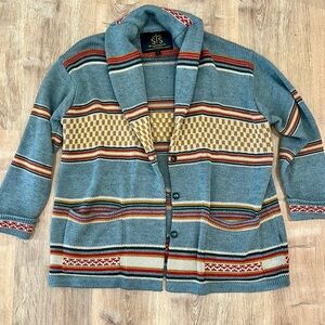 Cozy cardigan with vibrant stripes. Features a mix of colors. Perfect for layering.