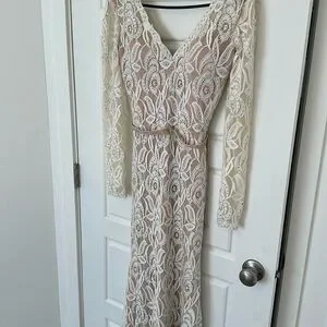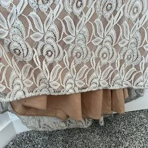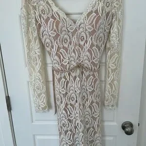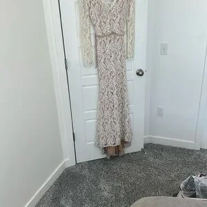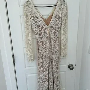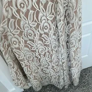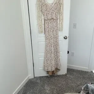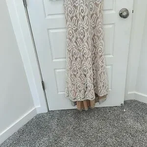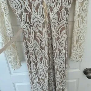 This stunning cream gown by Jovani showcases a sophisticated v-neckline and graceful bishop sleeves, making it an ideal choice for a bride or wedding guest. The elegant long sleeve design and flowing silhouette exude timeless charm, perfect for celebrating special occasions.