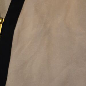 Elegant peach blouse with black trim. Features a stylish zipper detail. Perfect for any occasion.