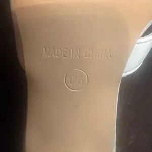 These sophisticated heels feature a pointed toe design with crisscrossing straps in white and brown, creating a modern geometric pattern. The shoes are adorned with metallic grommets for an edgy touch, while the inner sole offers a comfortable fit. Perfect for adding a contemporary flair to any outfit. Tried on never worn NWOB Scratch on on see pictures.