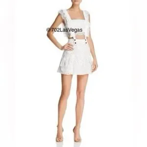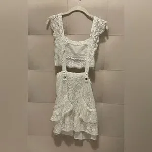 Lace trim and lined. Dress has functioning pockets, zipper, and silver snap closure. Color white, Size Small.