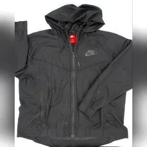 Women’s size 1X black Nike windbreaker. Fitted style with mesh lining and front pockets as pictured. Preowned with some visible inside stains. Will attempt to clean and update photos after current move is complete. Sold as is in current condition.