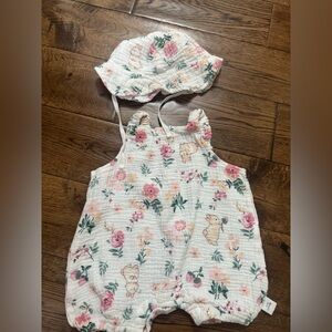 In excellent condition, size tag is missing but fits like a 3 month. No brand. Muslin/Gauze Material Bunny Romper and Hat Size 3 Month. Same or next day shipping!