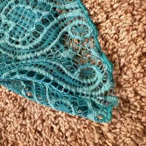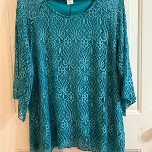 Chic teal lace blouse with intricate patterns. Perfect for stylish outings.