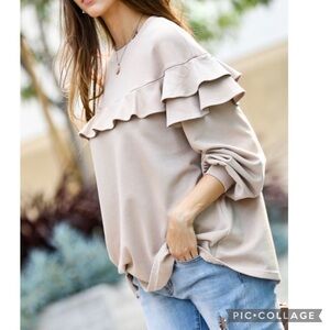 Deep Cream/Beige Top. Top has a Ruffle around upper half from front to back. Has double Ruffle @ the top of sleeves. Runs slightly big. 55% Poly 45% Cotton