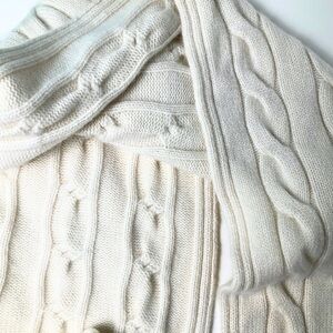 “This scarf is enhanced with a sumptuous weave that features flat and cable-knit ribbing for a three-dimensional appearance. It is crafted from Coarsehair® baby cashmere yarn with a fluffy, full-bodied texture that is pleasantly soft to the touch. When worn with a beanie and gloves, it creates the perfect comfortable accessory set for the coldest days of the year.”
