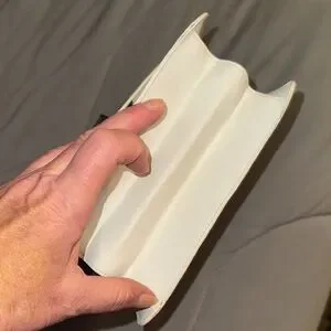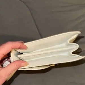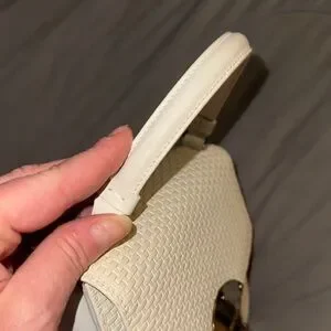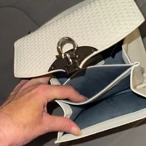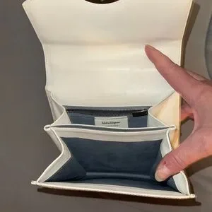 This elegant white satchel from Salvatore Ferragamo showcases a refined textured design, complemented by metallic hardware accents. Its medium size and structured silhouette make it a versatile choice for everyday sophistication. Bottom left side I posted two pictures of the small brown spots. I think they can’t be taken out. I used lever CPR. I just need to really get to it. Maybe a cobbler could do it easier.