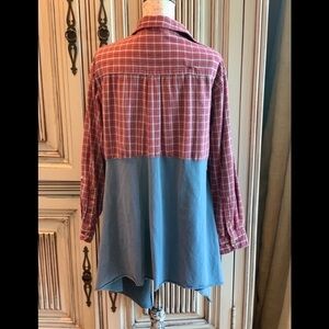 Painted Oyster “one of a kind” Upcycled Duster. NWOT. Never worn. Upcycled Red flannel pieced with super soft Gray/Blue Jersey.
